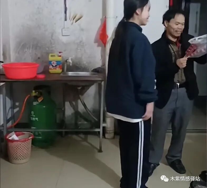 男子把单车交给孩子,接着他伸手从怀里往外掏东西,这时,大女儿也走了过来,开心地迎接父亲,女儿已经是初中生了,长得落落大方,个头比父亲都要高出半头。