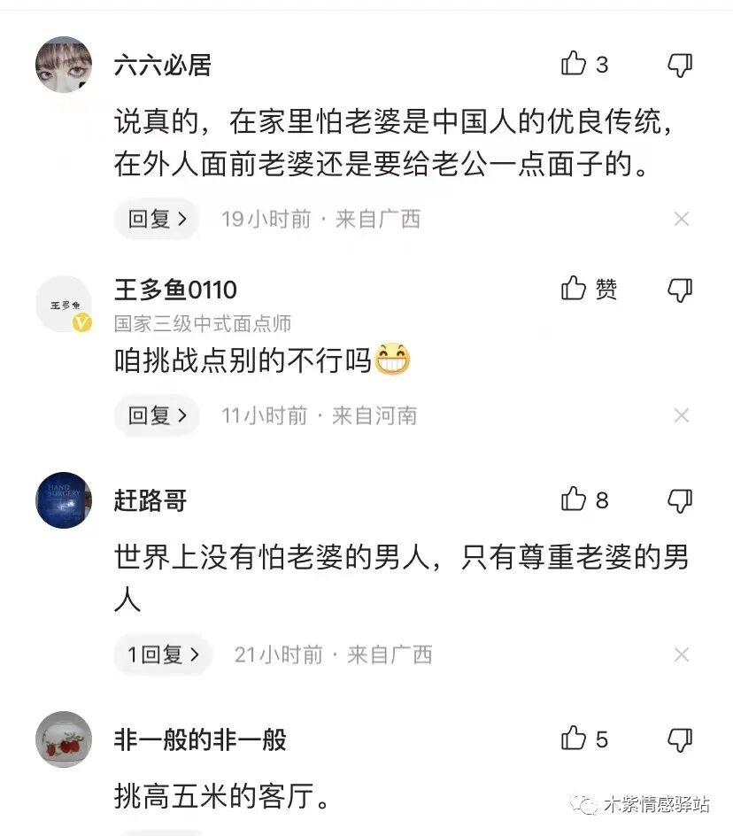 还有网友说,其实在家里怕老婆是中国男人的优良传统,在外人面前,老婆还是要给男人留一点面子的。