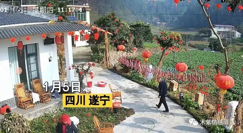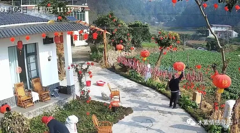 画面中可以看出,这是一处非常漂亮的农家小院,简直就像一幅美丽的风景画,小院不大,没有院墙,前面直接就是绿油油的大片农田,几间砖房,白墙灰瓦,地面上都铺了整洁的灰色地砖,屋檐下和外面的小路边,挂上了红红的灯笼,一派喜庆的景象,节日氛围浓厚。