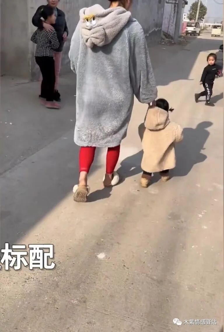 女子面对不时过往的村民们的好奇的目光,丝毫不在意,等家里的小孩子过来的时候,她起身跟在宝宝的后面,在街头走来走去。