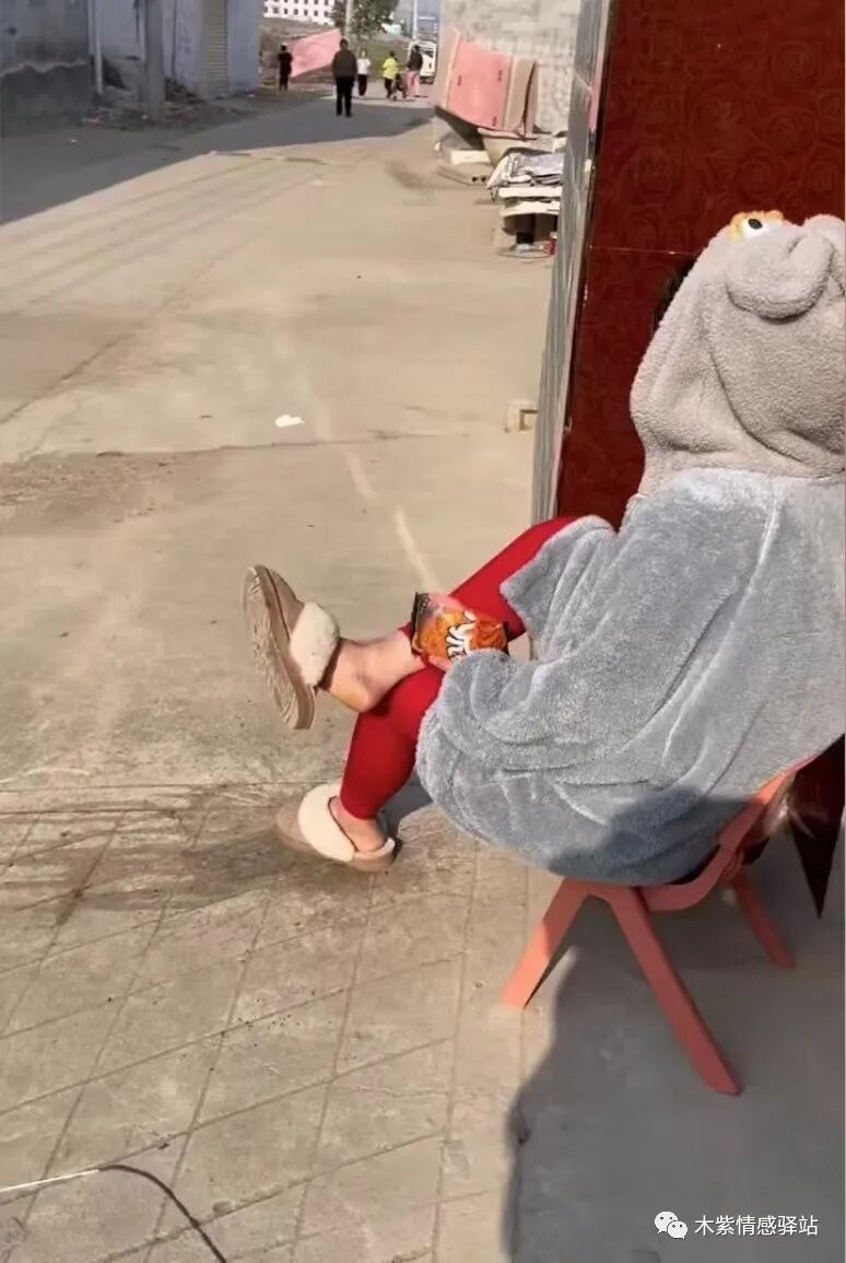 一名年轻女子,穿着灰色的毛茸茸的连帽睡衣,肥大宽松而又随意,下身穿着大红色的秋裤,光脚趿拉着一双棉拖鞋,她坐在自家大门口,一张红色 的小椅子上,翘着二郎腿,晒着太阳,整个人看起来悠闲舒适,慵懒惬意。