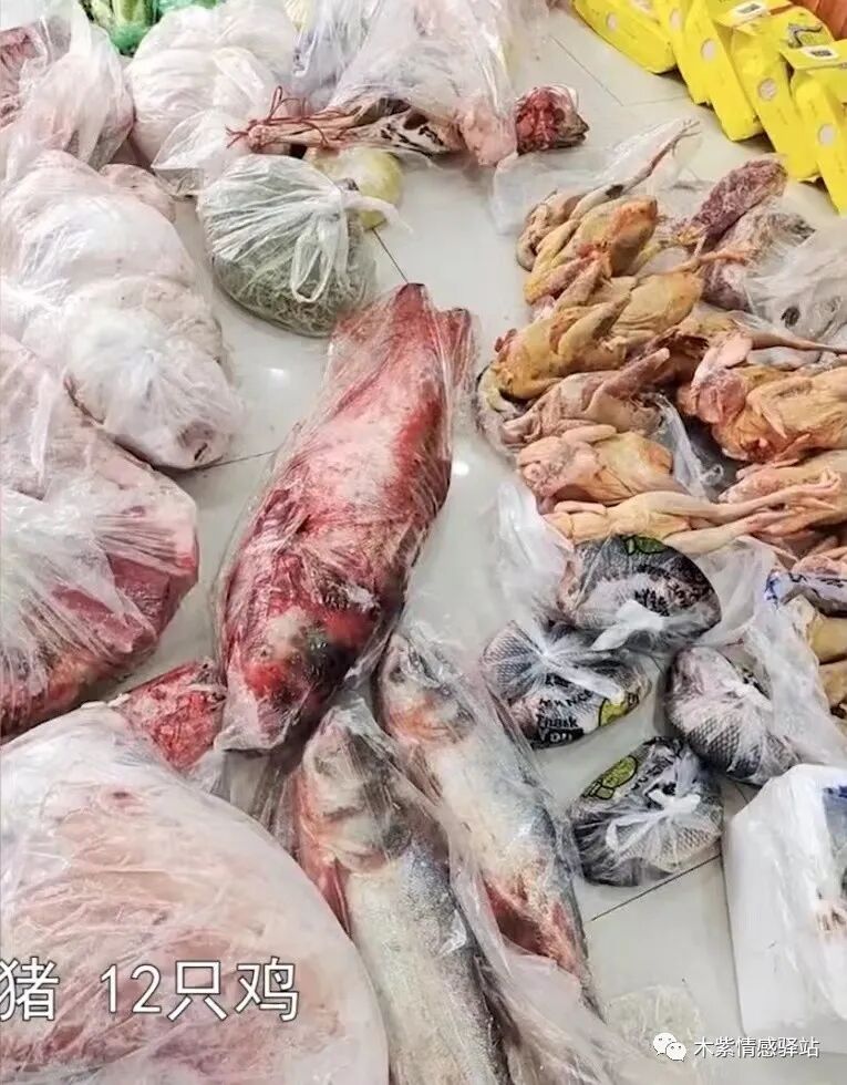 只见客厅的地板上,摆满了各种新鲜食材,外面还精心地包裹了白色的塑料袋,女子用手指着地上的礼品,逐一介绍:这是一头猪,两只羊,还有12只鸡。