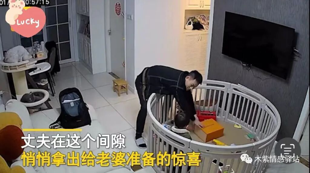 男子看到妻子进了卫生间,接着把宝宝重新放进围栏里面,快速从自己的背包里拿出来一个精致的礼盒,原来,他趁着这间隙,想要给老婆一个大大的惊喜。