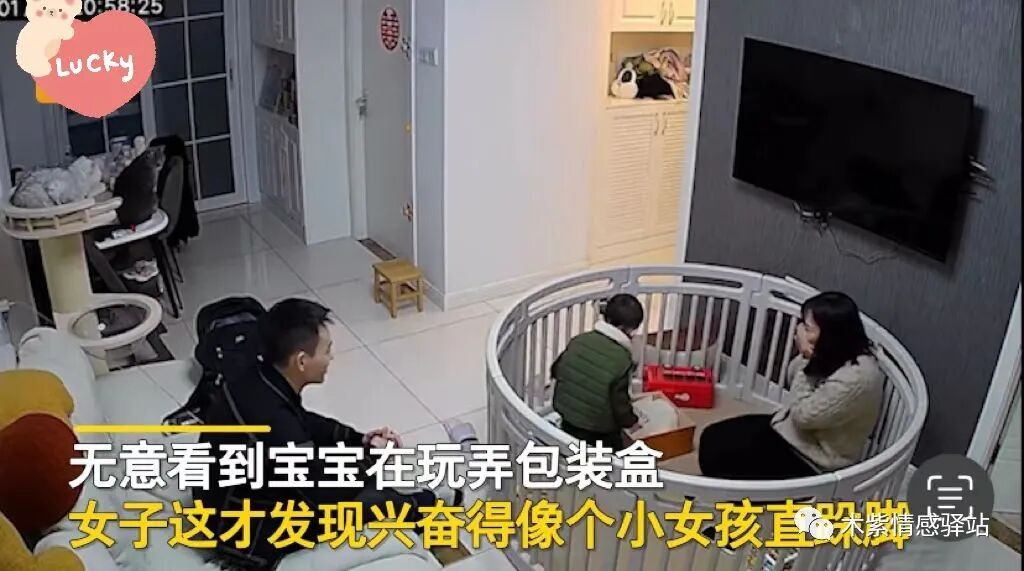 妻子心心念念一款名牌包包很久了,但是一直不舍得买,这次男子发了工资,立马给妻子买了包包,他把礼品放进围栏里,重新做回沙发上,若无其事地刷着手机。宝宝好奇心强,忍不住去拆礼盒。