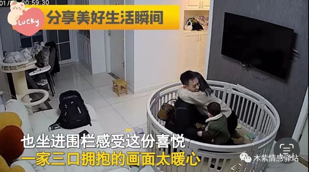 妻子抑制不住内心的欣喜,仰面大笑,而丈夫则一脸宠溺地看着妻子和宝宝,满满幸福的感觉。后来爸爸也坐进了围栏,一家三口拥抱在一起,画面太暖心,让人忍不住感动落泪。