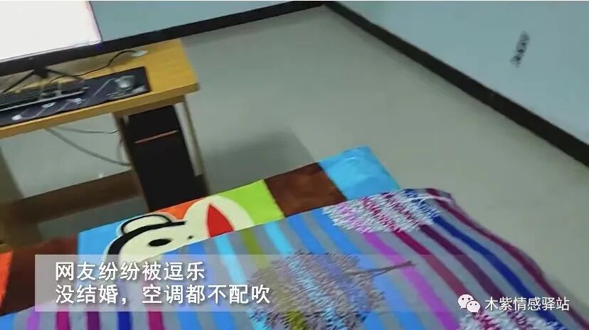 男子接着又晒出了自己的单身房间,只见房间内就孤零零的一张单人床,上面铺着大嘴猴图案的廉价床单,被子也是自己铺的,床旁边就一张简易电脑桌,男子说这是自己新买的。
