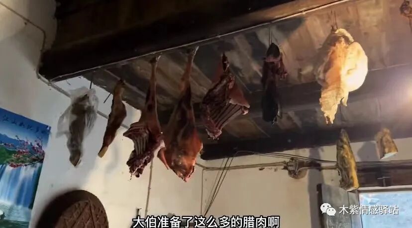 他们到了大伯家中,首先映入眼帘的是房梁上挂着的满满的腊肉,在柔和的灯光下,散发着诱人的光泽。女子忍不住问道:哇,这多么腊肉啊?这都是猪肉和羊肉吗?