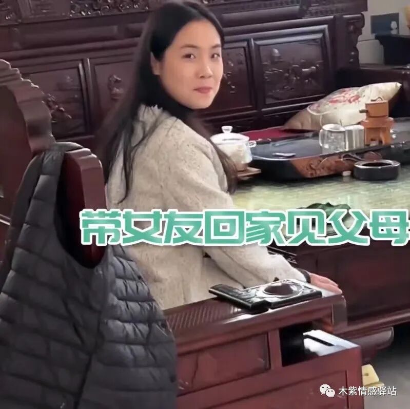 坐标广东某地,有位男网友分享了自己女友跟着回家见父母的短视频,画面中,一名年轻女子,穿着米白色的短外套,内搭黑色高领打底衫,留着披肩长发,化着淡妆,双手放在膝盖上,正乖巧地坐在红木沙发上。