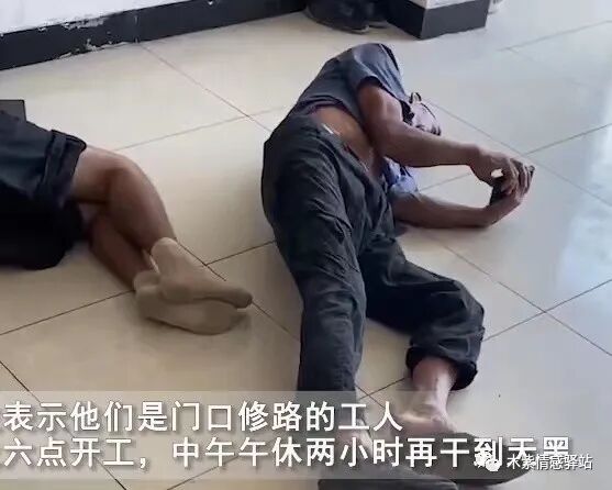 男子看到这一幕,内心酸楚,他说这些民工们都是门口修路的工人,他们早上六点开工,中午午休两小时,再接着干到天黑,工作很辛苦。