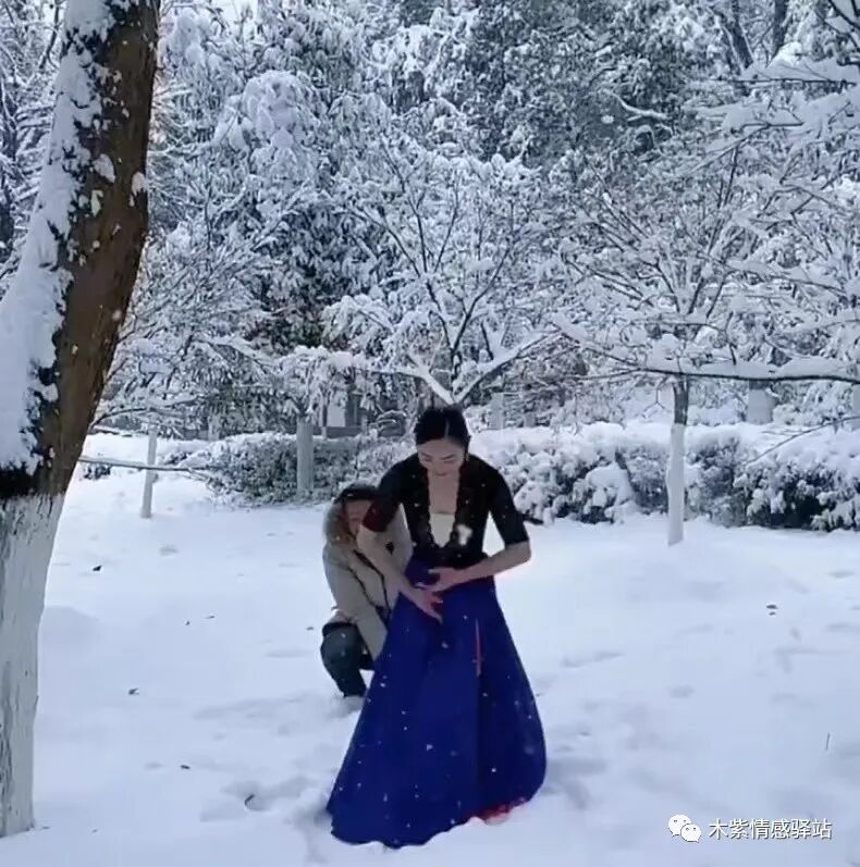 看女子做出撒雪的姿势,犹如天女散花一般,她身后的男子,穿着厚厚的棉衣,戴着帽子,小伙子很配合她的每一个动作,力求把照片拍得精益求精,摄影团队也是非常敬业。