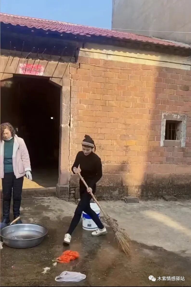 坐标江西某地,有网友分享一段短视频,画面中一名年轻女子手里拿着大扫把,正在院子里冲洗地面,她穿着一身黑色的紧身衣,头发用发带束起来,整个人看起来干净利落。
