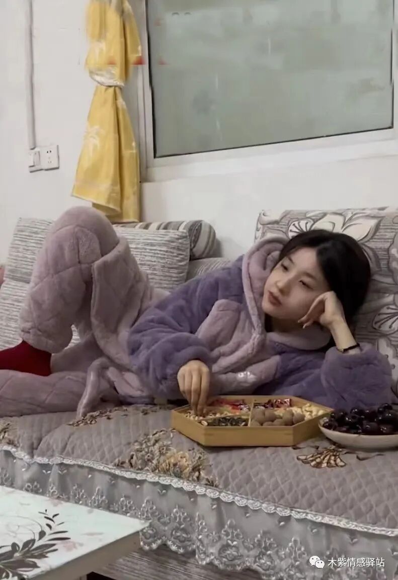 可是,接下来画风一变,女子在娘家吃零食的画面,女子穿着睡衣,慵懒地斜躺在沙发上,眼前的零食托盘里,放满了各种零食小吃,女子翘着二郎腿,眼睛盯着电视机,边看电视边不停地往外扔零食和垃圾。