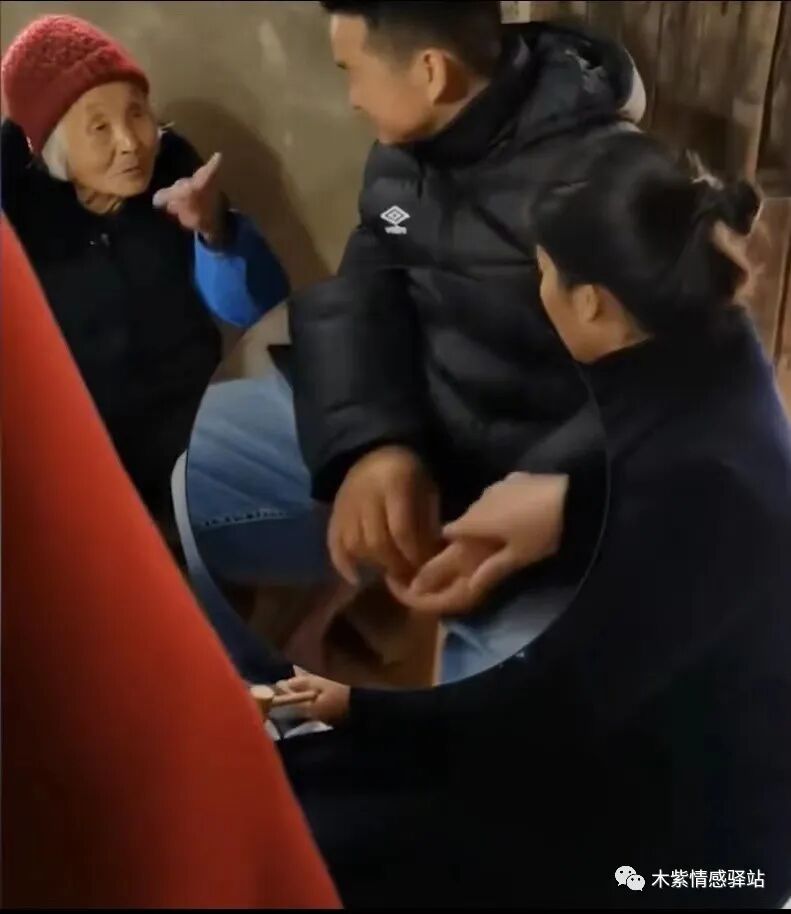 男子带着女友坐在凳子上,围着火炉取暖,旁边坐着一位白发苍苍的老人,看着他带来的儿媳妇,笑得合不拢嘴。