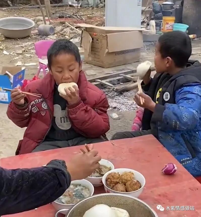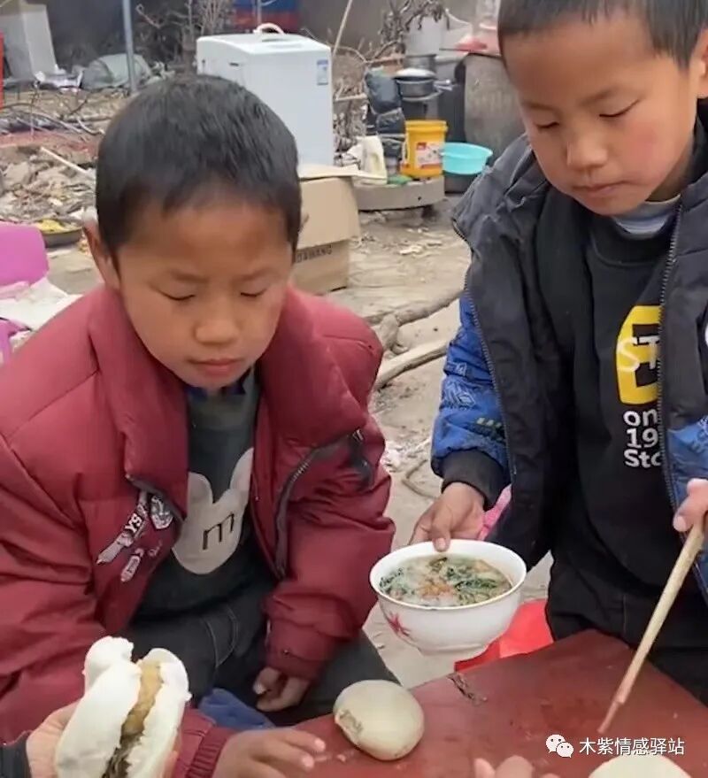 门口的大男孩接过馒头,腼腆一笑,接着小心翼翼地咬了一大口,两个小弟弟还不忘提醒他:快吃吧,别凉了!