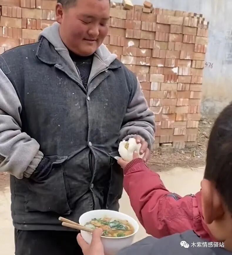 中年女子看了一眼门口的大男孩,转头对自己的孩子说:乖,给他夹个馍吃!