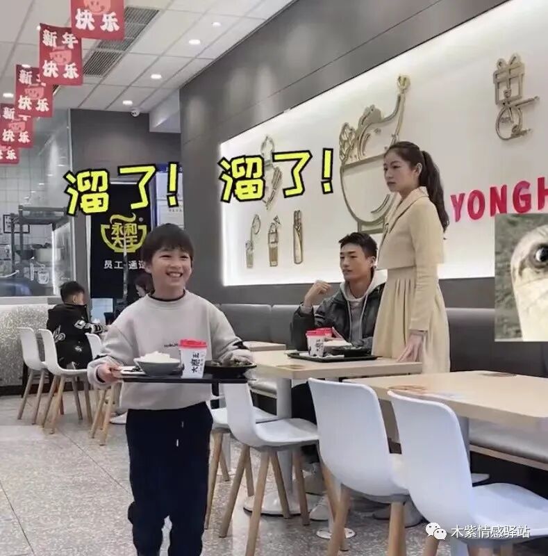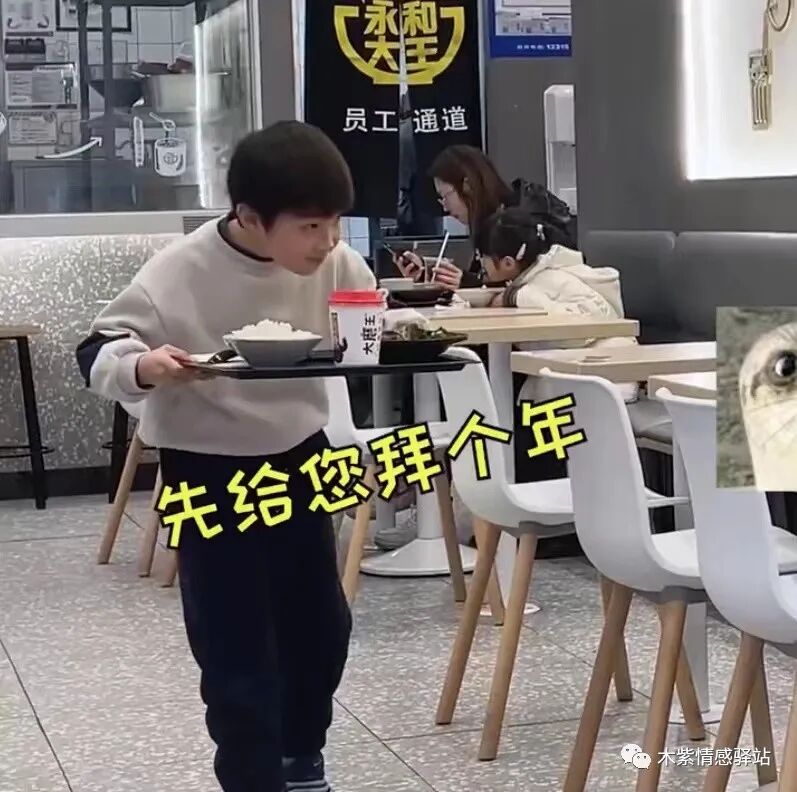 多亏这个小男孩机灵,发现自己撞破了老师的“好事”,担心以后会被穿小鞋,于是赶紧冲着老师深深鞠躬,给老师拜年,问声好,随后端着餐盘,笑嘻嘻地快速溜走了。
