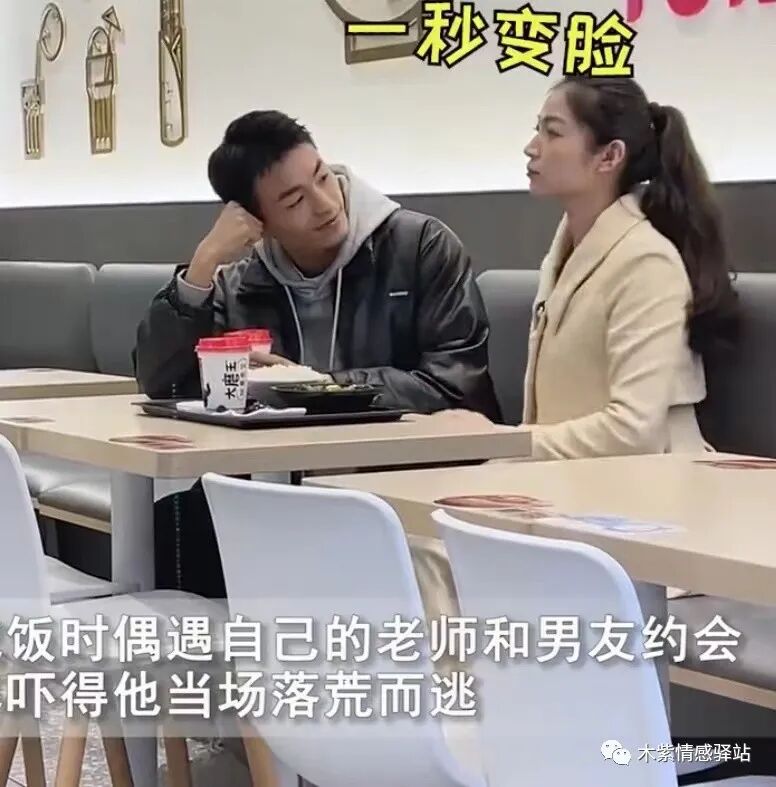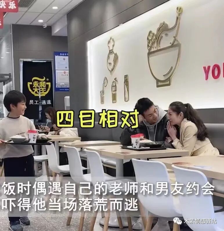 男孩觉着有点眼熟,于是停下脚步仔细再看,等女子抬起头,男孩发现,原来,这是自己的老师啊,旁边男子是她的男友,两个人恰好在这里吃饭约会。
