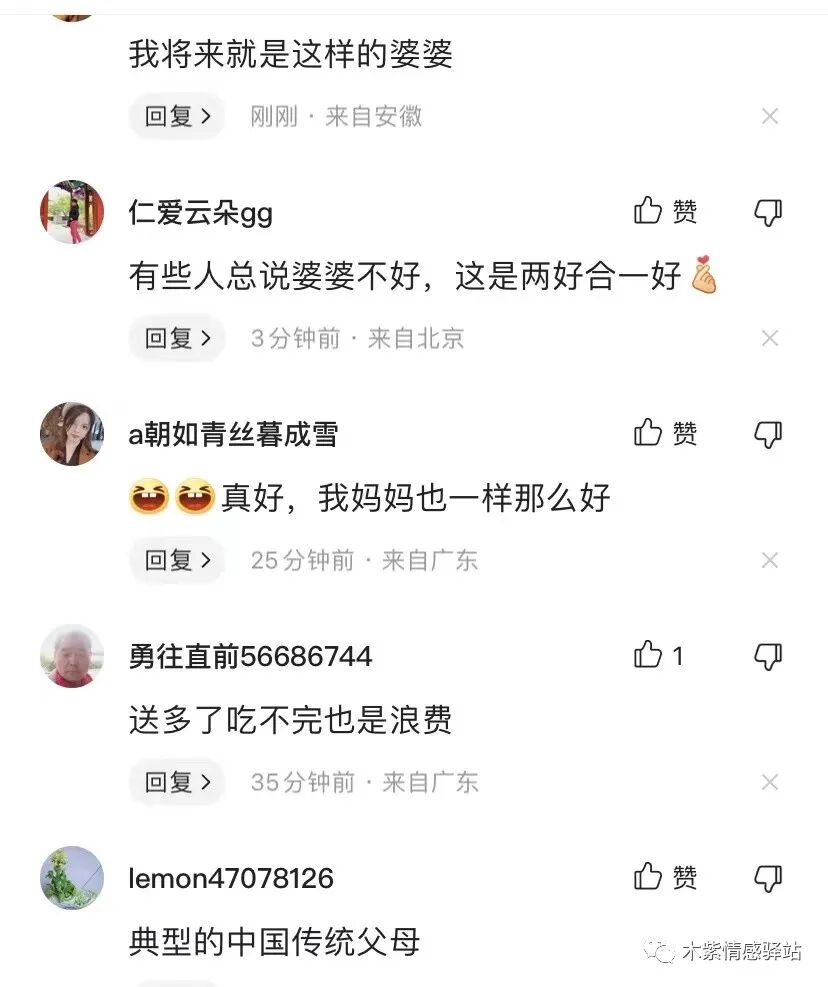 不过,也有的网友说出来不一样的观点,她说懂得感恩的儿媳会喜欢这样的 婆婆,不懂得感恩的则会嫌弃送这么多来,给她添麻烦,吃不完放烂了还要清理。