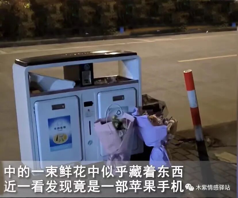 男子慢慢走近,正要弯下腰去捡起来,忽然发现其中一束鲜花中似乎藏着东西,伸手拿起来一看,竟然是一部崭新的某水果牌手机。