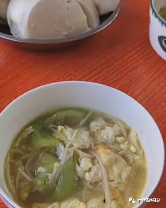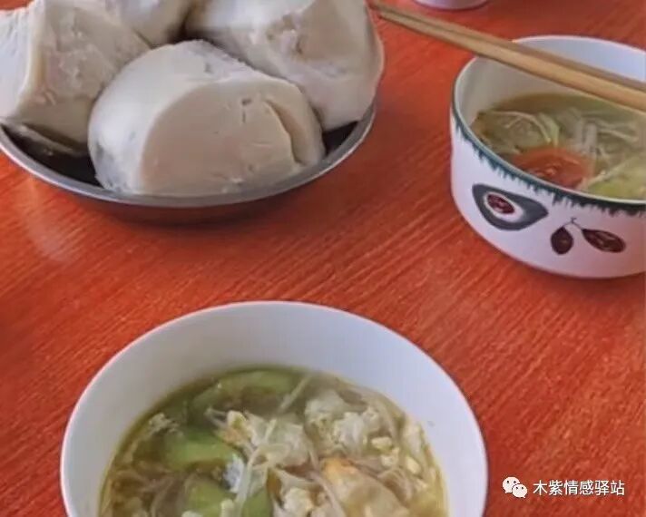 坐标安徽阜阳,一名女生分享了一段视频,画面中,这是一张简易的红色餐桌,上面摆着简单的餐具,两个印花瓷碗中,盛放着鸡蛋炒丝瓜,而另一个银色的铝盆里,则放着几个白面馒头。