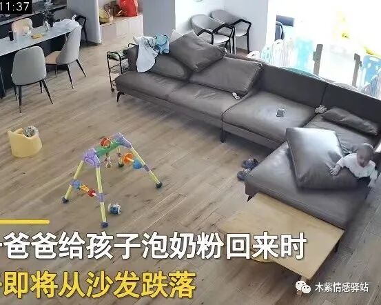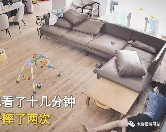 爸爸本来以为自己做的预防措施很到位,可是,等他出来的瞬间还是被惊呆了:只见宝宝一头从沙发上栽落下来,重重地摔倒在木地板上。