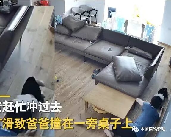 爸爸脚下打滑,他也撞到了旁边的桌子上,爸爸顾不上自身的疼痛,心疼地抱起来宝宝,耐心安抚,内心满是自责。