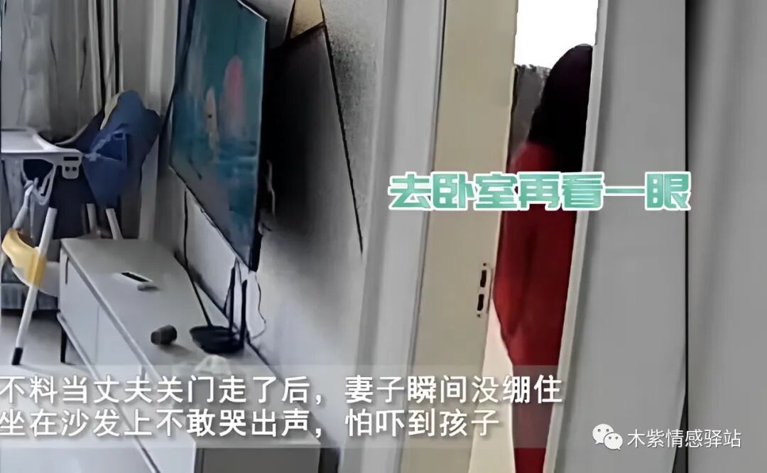 看着丈夫越走越远,女子情绪忍不住崩溃,可是她害怕哭出来又吓着孩子,只好走进卧室里,从卧室的窗户往外看,一直看到丈夫的背影消失在视线里,她才强忍住悲伤的情绪,转回笑脸,从卧室慢慢走出来,重新回到客厅陪伴孩子。