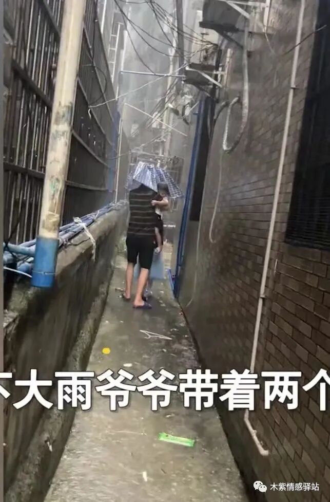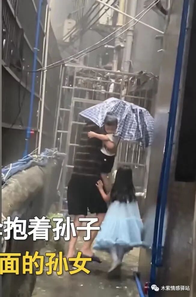 爷爷手里只拿了一把伞,而且瓢泼大雨下起来,让人猝不及防,他怀里紧紧抱着年幼的小孙子,旁边还有穿着蓝色纱裙的大孙女,只能让她自己走着。