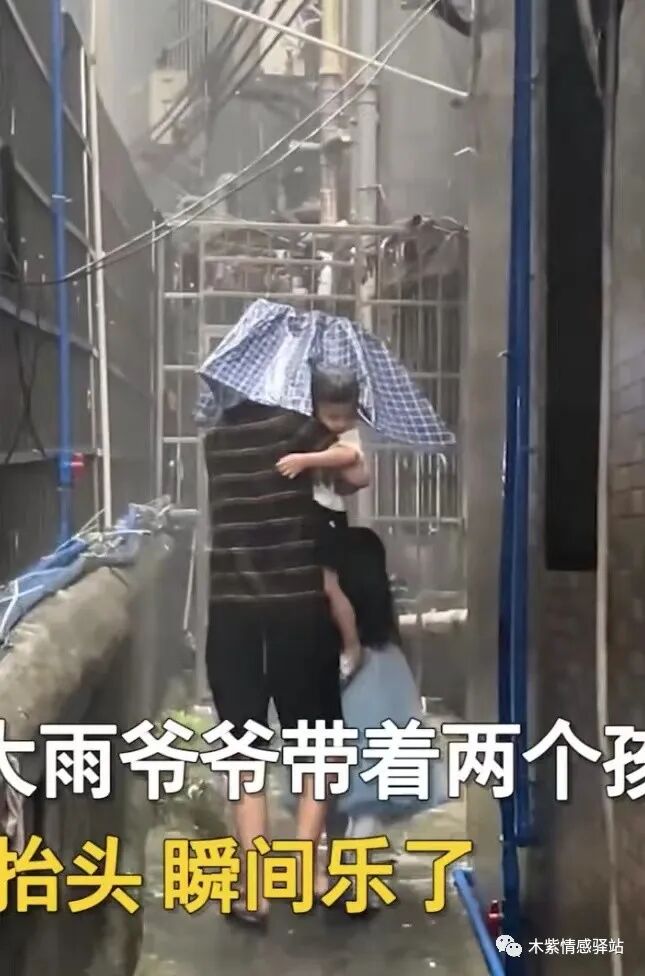 网友爱生活的橙子:其实爷爷还是比较偏爱孙子的,孙子抱在怀里,孙女独自走着,只是他不知道伞在外面而已。