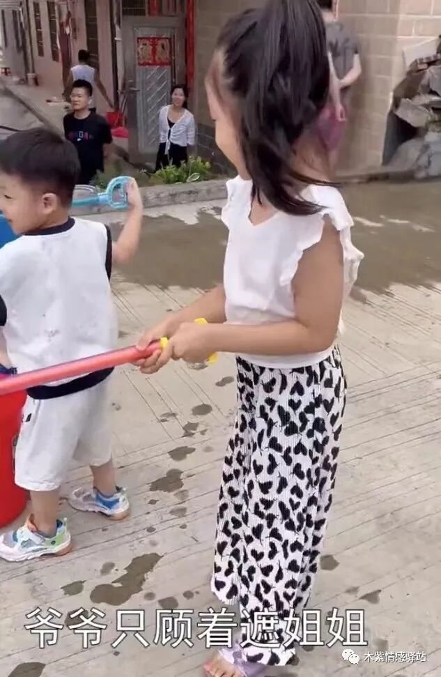 宝妈跟在后面,看到眼前的一幕,瞬间乐了:看爷爷全程小心翼翼的样子,生怕两个孩子被淋到,没想到,最安全的地带反而成了最“危险”的。