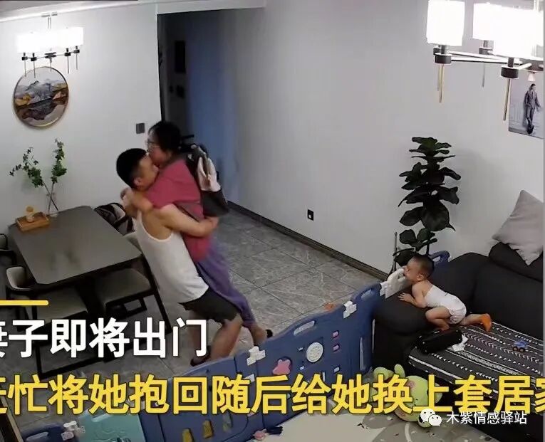 男子见状赶紧从沙发上跳了起来,三步并作两步,追到妻子身后,紧接着把妻子拦腰抱起来,不顾妻子的挣扎,把她抱进房间里面。