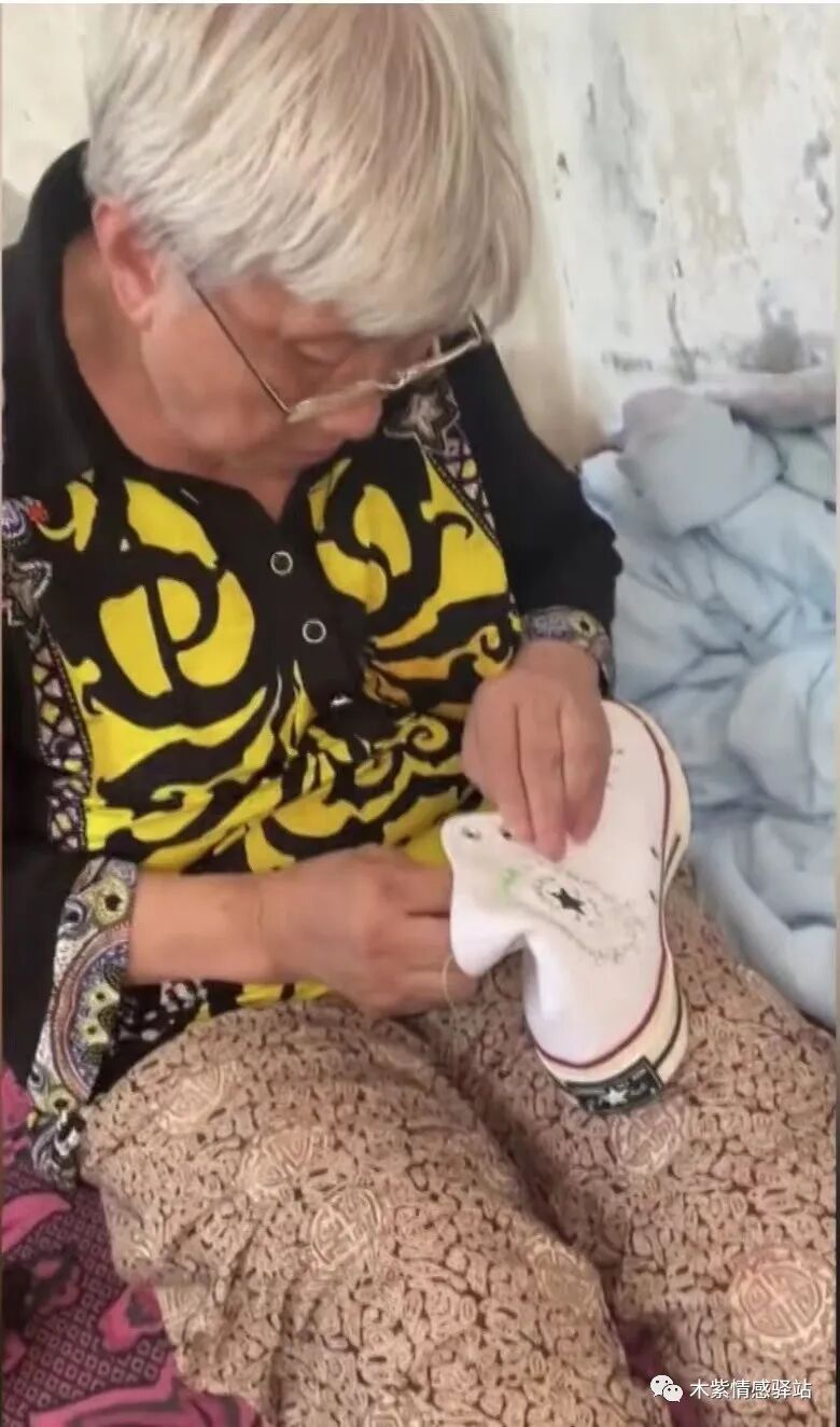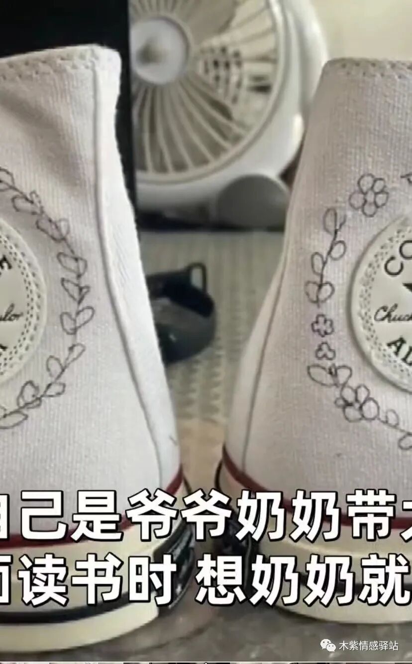 有这么一位老奶奶,她在孙子的球鞋上,精心地绣了一圈漂亮的花边,孝顺的孙子把这双鞋,摆在床头边,每当想念奶奶的时候就拿出来看一看,以解思念之情。