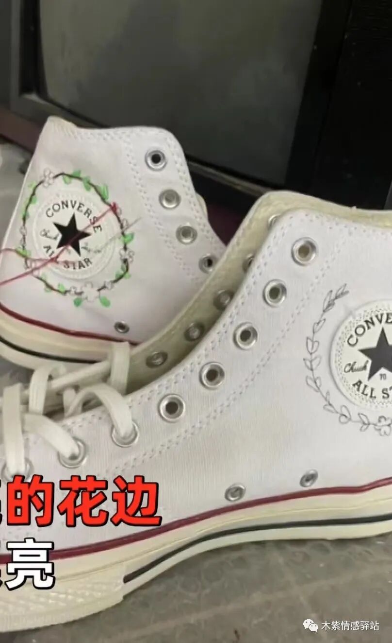 奶奶年轻的时候就心灵手巧,擅长刺绣,虽说年纪大了,眼睛都花了,但是绣花水平丝毫不减当年,老人家穿针引线,很快就在球鞋上绣了一对漂亮的花边。