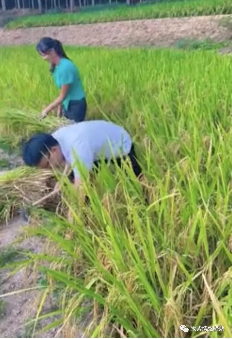 吃过饭,男子跟着女生下地去收稻谷,虽然从小没干过农活,但是他做起来有模有样,热得汗流浃背,从不叫苦。