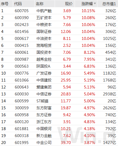 从涨幅居前的多元金融板块来看,中航产融、五矿资本、中粮资本、国联证券、中油资本、渤海租赁等多股涨停,国投资本、越秀金控、陕国投A、广发证券、中信建投、爱建集团、中信证券等亦涨幅居前。