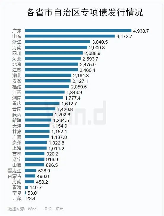 此外从各省市自治区来看,目前专项债发行规模最大为广东省,共发行了91只,融资达4938.75亿。紧随其后山东、浙江、河南等10个省市发行规模也较大,均超过2000亿。此外江西、湖南等11个省、市、自治区发行也不小,超过1000亿。其余省、自治区融资在1000亿以下,可见今年各省市自治区之间专项债发行差距较大。
