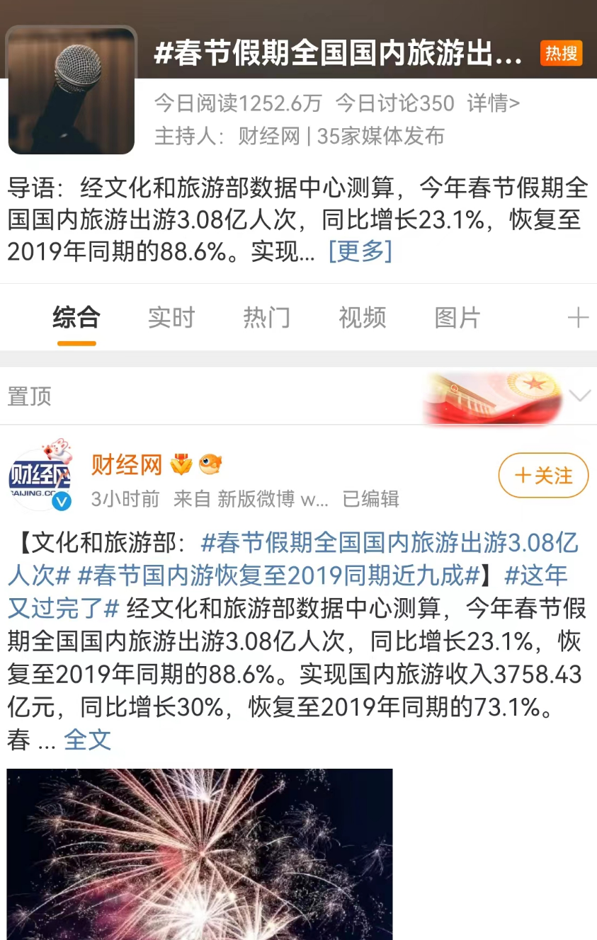 1月28日是兔年春节后的首个工作日,“春节假期国内旅游出游3.08亿人次,恢复至疫情前2019年同期的88.6%”的消息登上微博热搜。