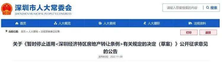 根据中国基金报报道,近日,深圳市人大常委会官网发布关于《暂时停止适用〈深圳经济特区房地产转让条例〉有关规定的决定(草案)》(下称《决定》)公开征求意见的公告。