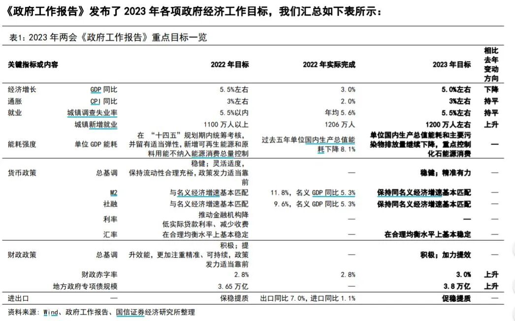 平安证券称,GDP增长目标5.0%左右,更注重调结构。今年是全面贯彻党的二十大精神的开局之年,整体基调更注重高质量发展。在此背景下,各类政策要加大协调配合,共促高质量发展合力。一是财政政策,“积极的财政政策要加力提效”,赤字率上升至3%,专项债3.8万亿,进一步完善税费优惠政策,加快实施“十四五”重大工程;二是货币政策,“稳健的货币政策要精准有力”,在与名义经济增速基本匹配的要求下,再宽松的可能性有限;三是产业政策,要发展与安全并举,促进传统产业改造升级,培育壮大战略性新兴产业,着力补强产业链薄弱环节;四是社会政策,要落实落细就业优先政策。另外,要有效防范化解重大经济金融风险,关注优质头部房企风险以及地方政府债务风险。