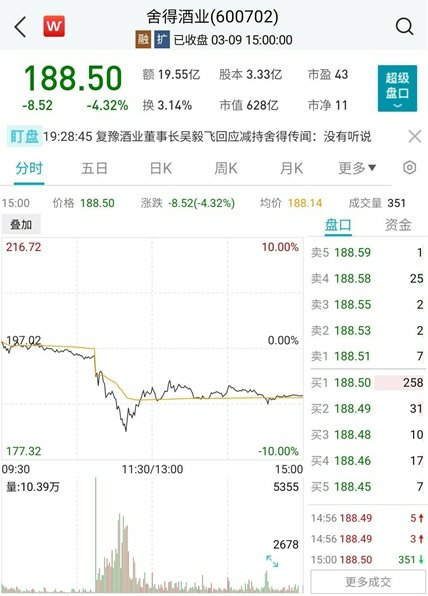 此外,盘中白酒出现巨幅波动。3月9日,舍得酒业上午股价出现闪崩,一度触及跌停板。不过随后快速回升,截至收盘,舍得酒业下跌4.32%。针对股价异动,市场有质疑公司遭遇“乌龙指”。舍得酒业有关负责人回应称:“(公司经营)一切正常”。