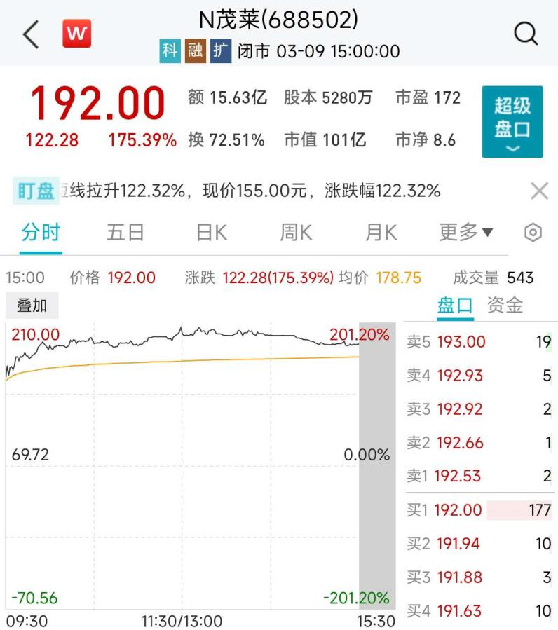 3月9日,科创板新股茂莱光学上市,发行价69.72元,开盘即飙涨119.45%,最高上涨201.2%;盘中并触发临停。如果按照最高价210元计算,中一签(500股)可大赚超7万元。截至收盘,茂莱光学报收192元,上涨175.39%。若继续持股,中一签仍然可大赚6.1万元。