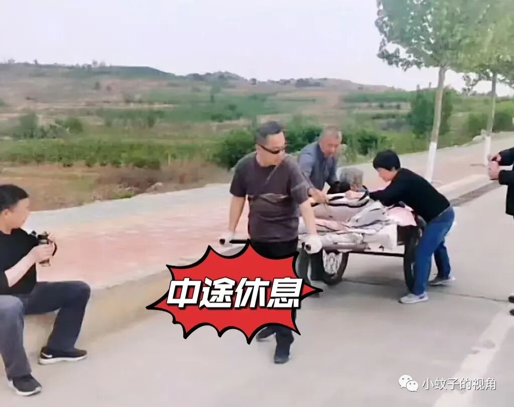 于是,就出现了我们上面提到的那一幕:几个年过半百的男男女女守着一辆架子车,架子车上躺着一位老太太,一行人走在马路上格外引人注目。