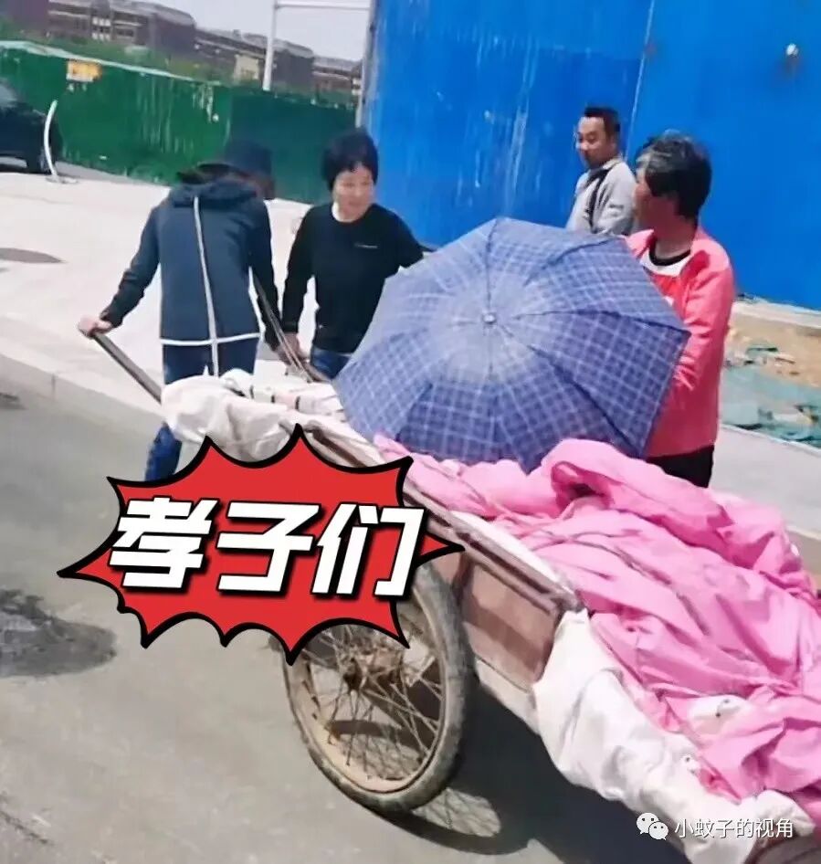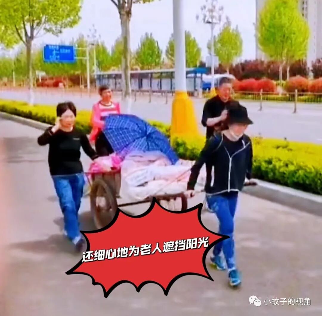 据知情人爆料:这几个年过半百的男男女女其实是一家人,躺在架子车上的老太太是他们的母亲。