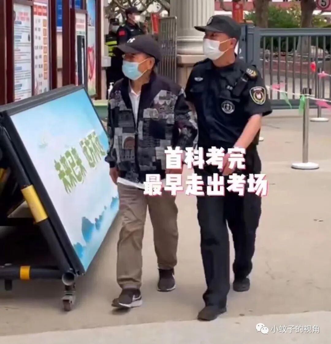 令人没想到的是,首科考完老人还是最早走出考场的人,保安看到老人走出考场,赶紧迎上去把他送出门口。