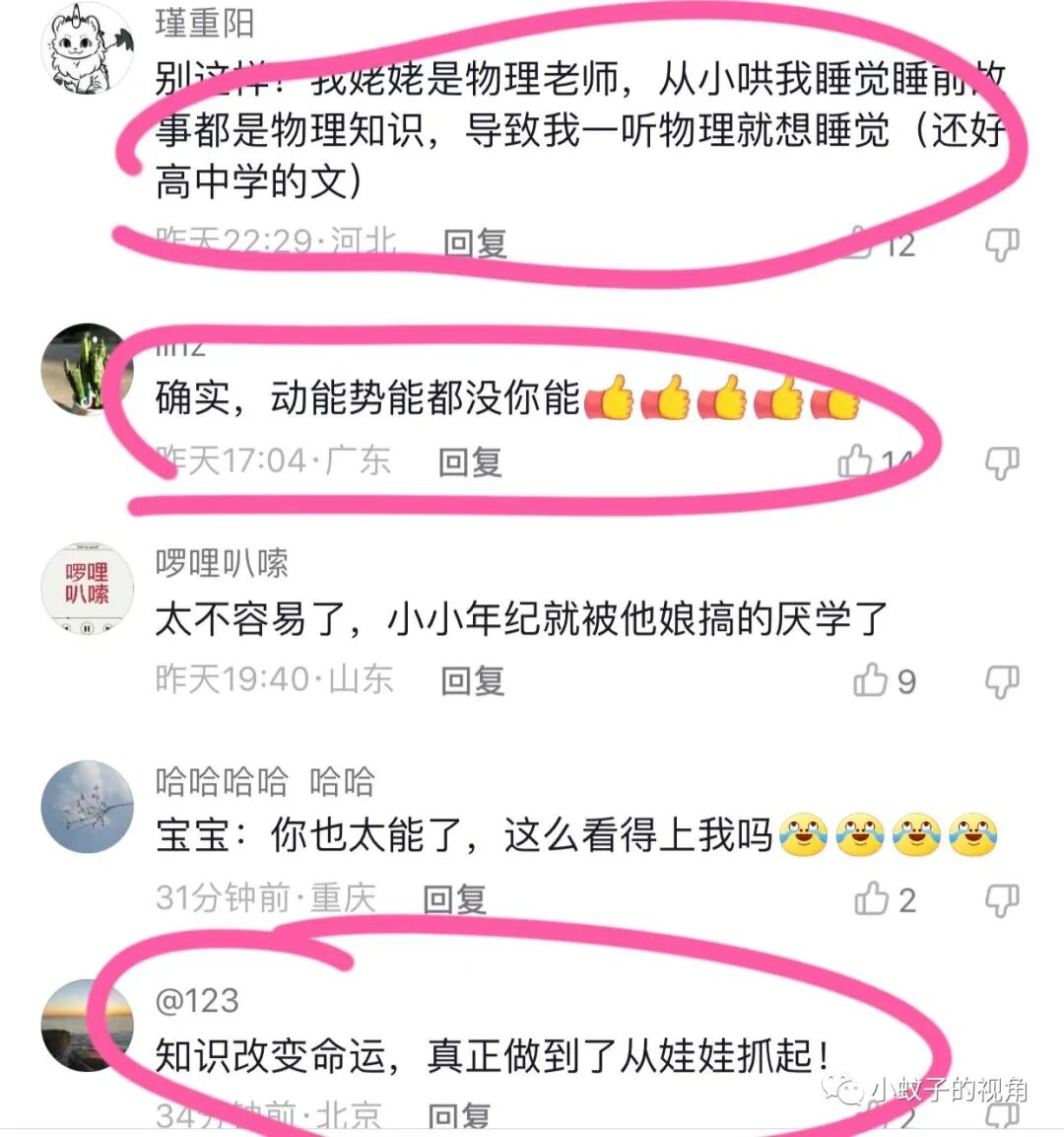 也有网友现身说法:别这样!我姥姥是物理老师,从小哄我睡觉,睡前故事都是物理知识,导致我一听物理就想睡觉,还好高中学的文。
