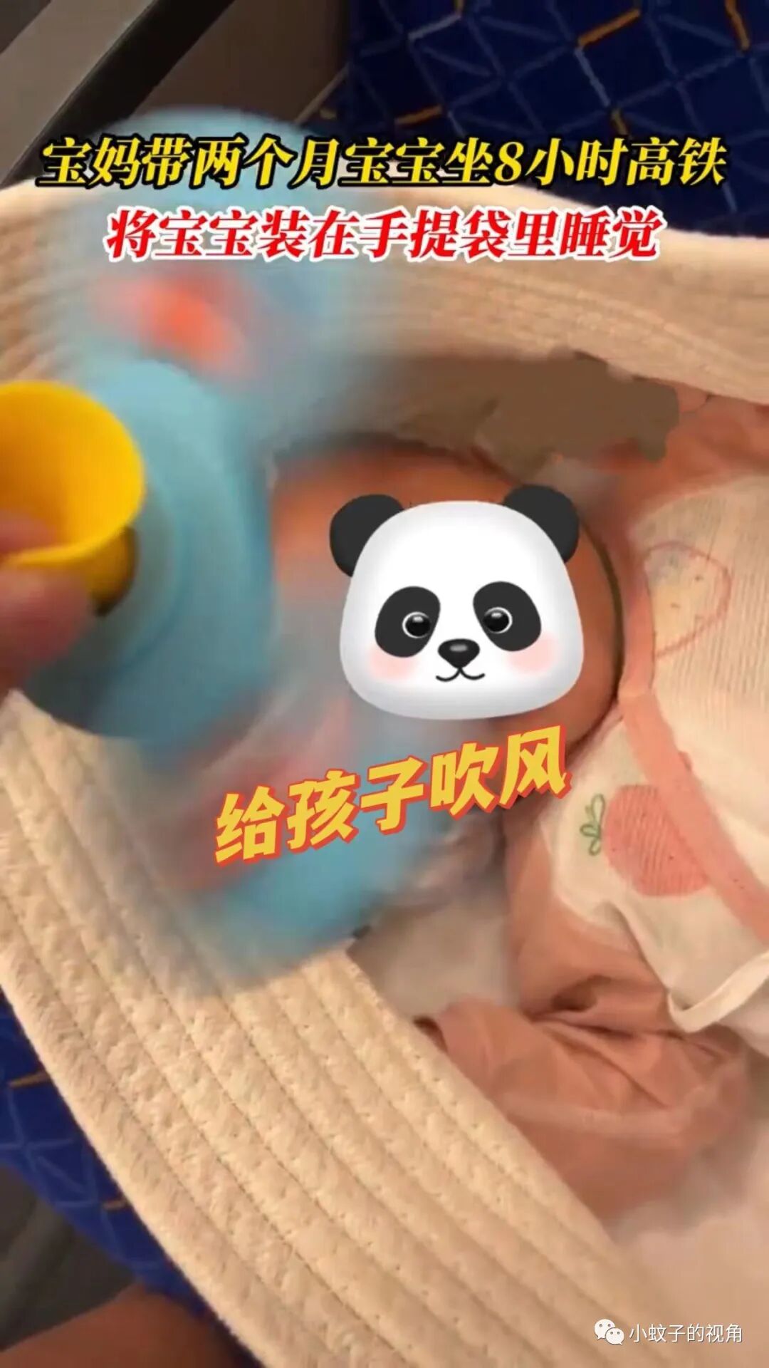 看到里面安睡的宝宝,女子怕孩子太热,还拿起小风扇给提篮里的孩子吹风,孩子感受到凉风,双手挥舞了一会儿,又甜甜地睡了。
