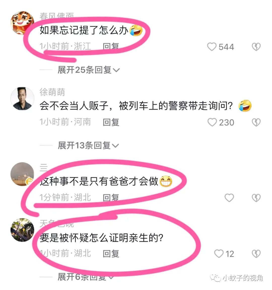 也有网友担心:这样带孩子,会不会被当成人贩子?被列车上的警察带走询问?