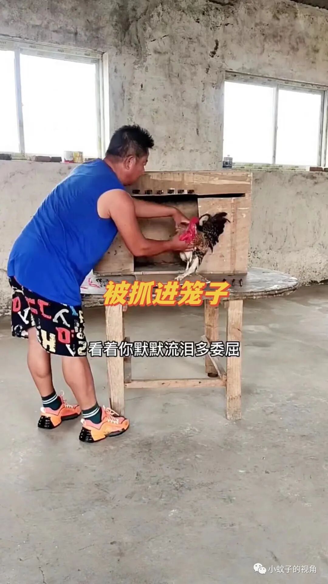 无奈却被男子摁着身体关进了笼子里。为了防止公鸡逃脱,男子用六根木棍自上而下锁住了这个笼子。