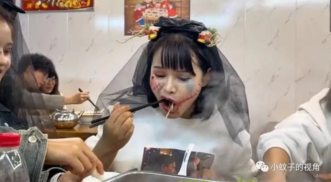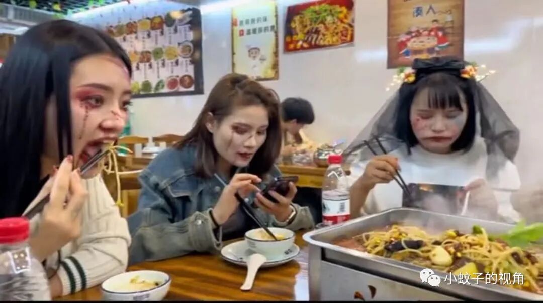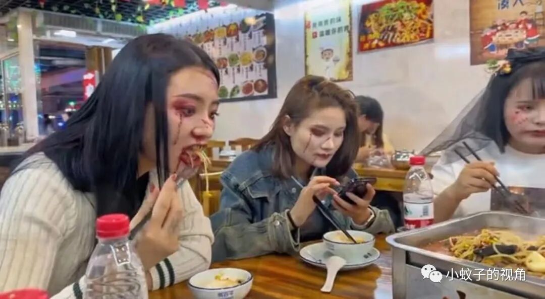 只见这几名女孩有的化着“吸血鬼”的妆容,有的化着“女鬼”的妆容,各个都是面容狰狞,坐在一起吃饭时,令整个饭店的气氛都显得非常诡异。