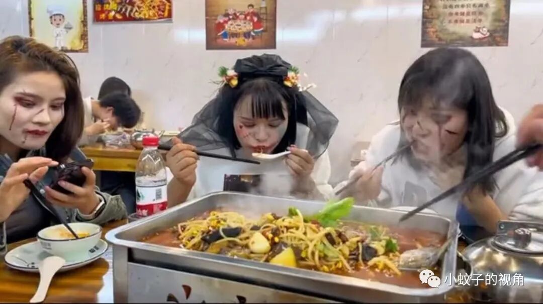 几个满脸“血迹”的女鬼大口吃饭,那画面胆小的看了都能做噩梦。其中一个女生看着同伴吃东西,都忍不住笑了。